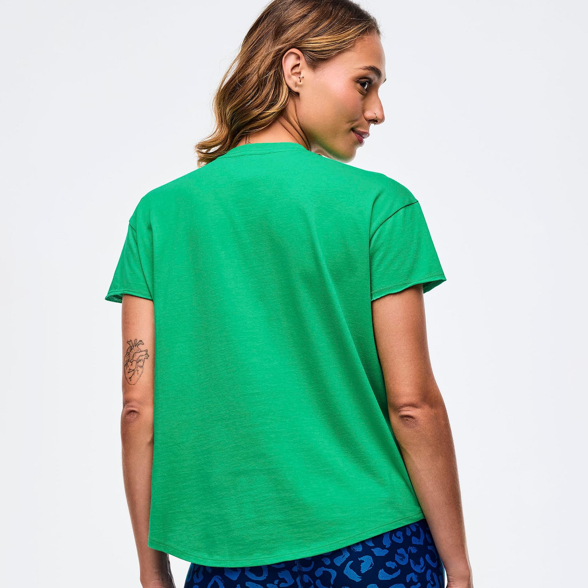 Featuring a Zumba-exclusive front graphic, this top not only showcases your passion for fitness but also makes a bold statement. The short sleeves provide a flattering fit while allowing for maximum airflow, making it perfect for those warm days or high-energy workouts. Whether you're dancing, stretching, or simply enjoying a day out, this top is designed to keep you looking chic and feeling confident.
