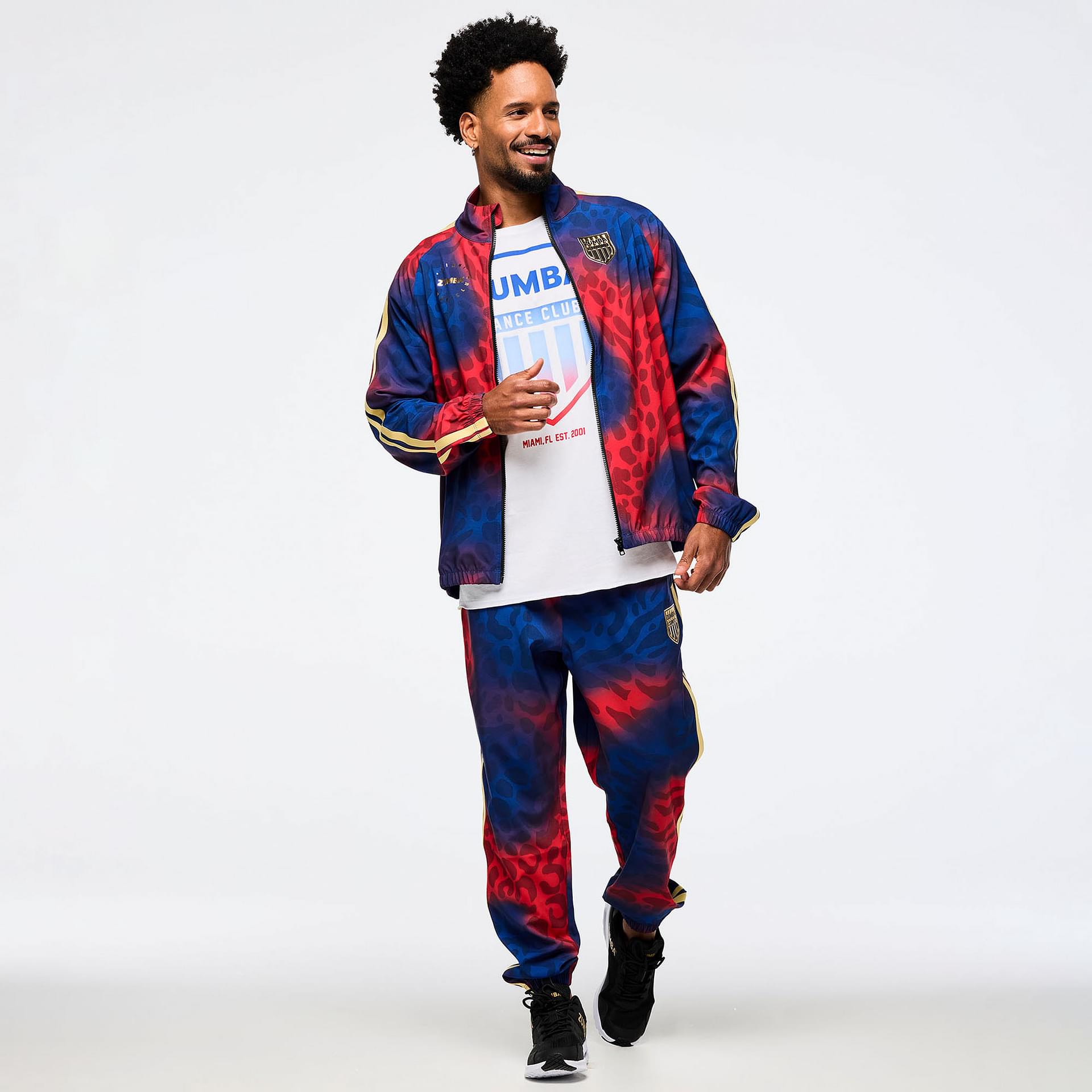 Convenience is key with inseam pockets that offer secure storage for your essentials. The bold Zumba-exclusive all-over print and the gold foil branded graphic on the chest showcase your passion for fitness and style. Additionally, the Zumba-exclusive branded 3D metallic shield on the chest adds a touch of sophistication, making this jacket a must-have for any active wardrobe.