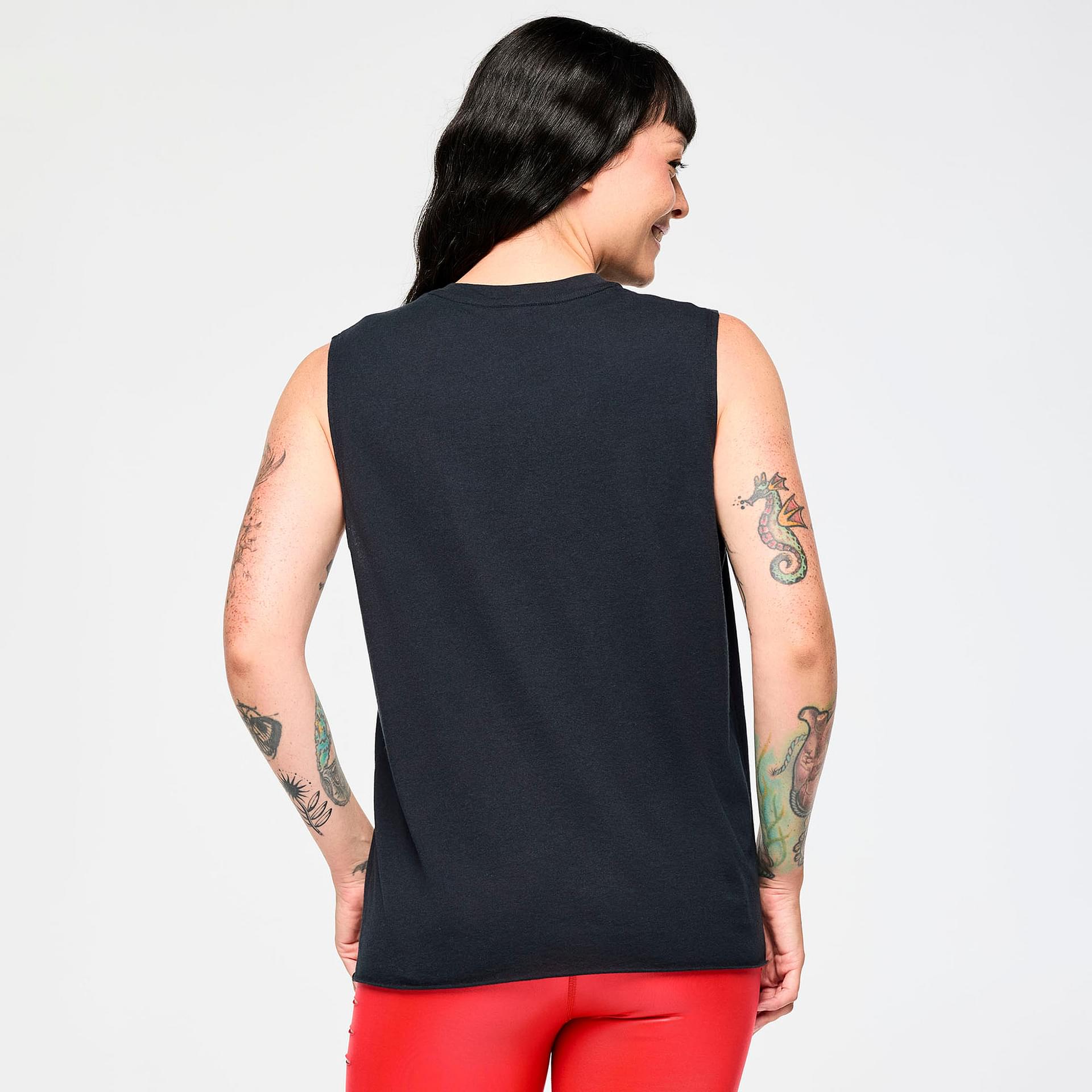 The rib knit neckband adds a touch of sophistication, while the raw edge bottom opening introduces a modern twist to a classic design. This unique detailing enhances the tank's overall aesthetic, allowing you to express your individuality with confidence. The Zumba-exclusive bold front graphic print serves as a vibrant statement, inspiring you to embrace your passion for dance and fitness.