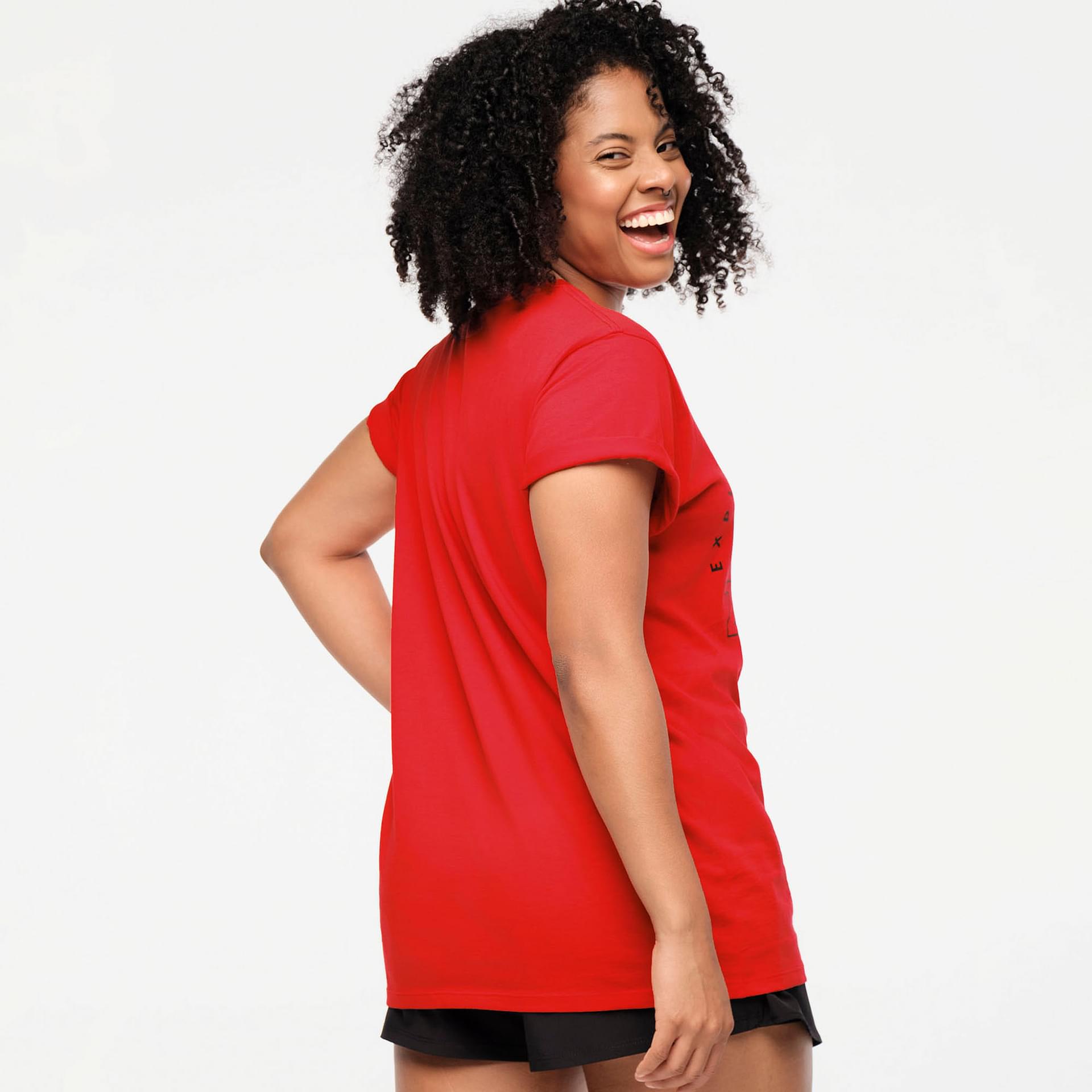 What truly sets this tee apart is its bold, Zumba-exclusive graphic print. This eye-catching design not only reflects the spirit of Zumba but also serves as a source of inspiration, motivating you to express yourself through movement. The vibrant color and unique graphics make it a standout piece that can easily be paired with your favorite leggings or shorts.