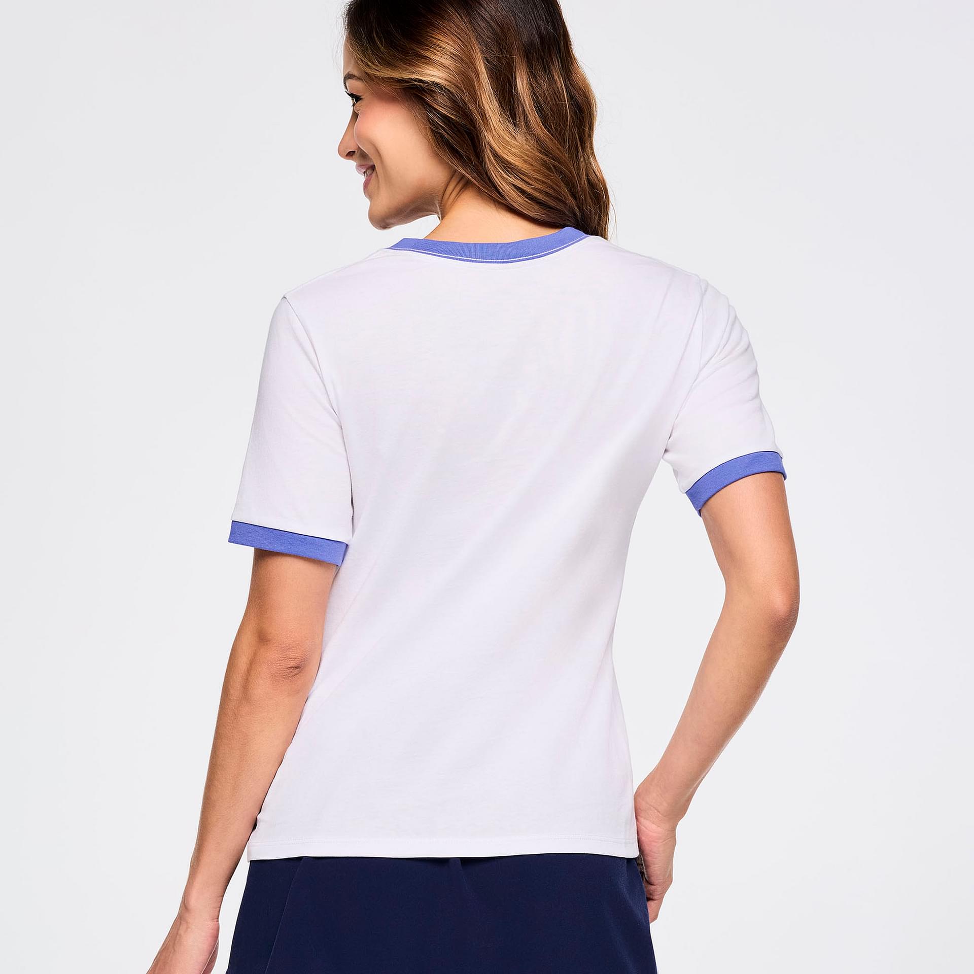 The easy fit silhouette ensures a relaxed yet flattering look, allowing you to move freely without any restrictions. The regular length provides just the right coverage, making it versatile enough to pair with your favorite leggings or shorts. What sets this tee apart are the contrast rib knit cuffs and neck band, which add a stylish touch while enhancing durability. These details not only elevate the overall aesthetic but also ensure that the tee retains its shape wash after wash.