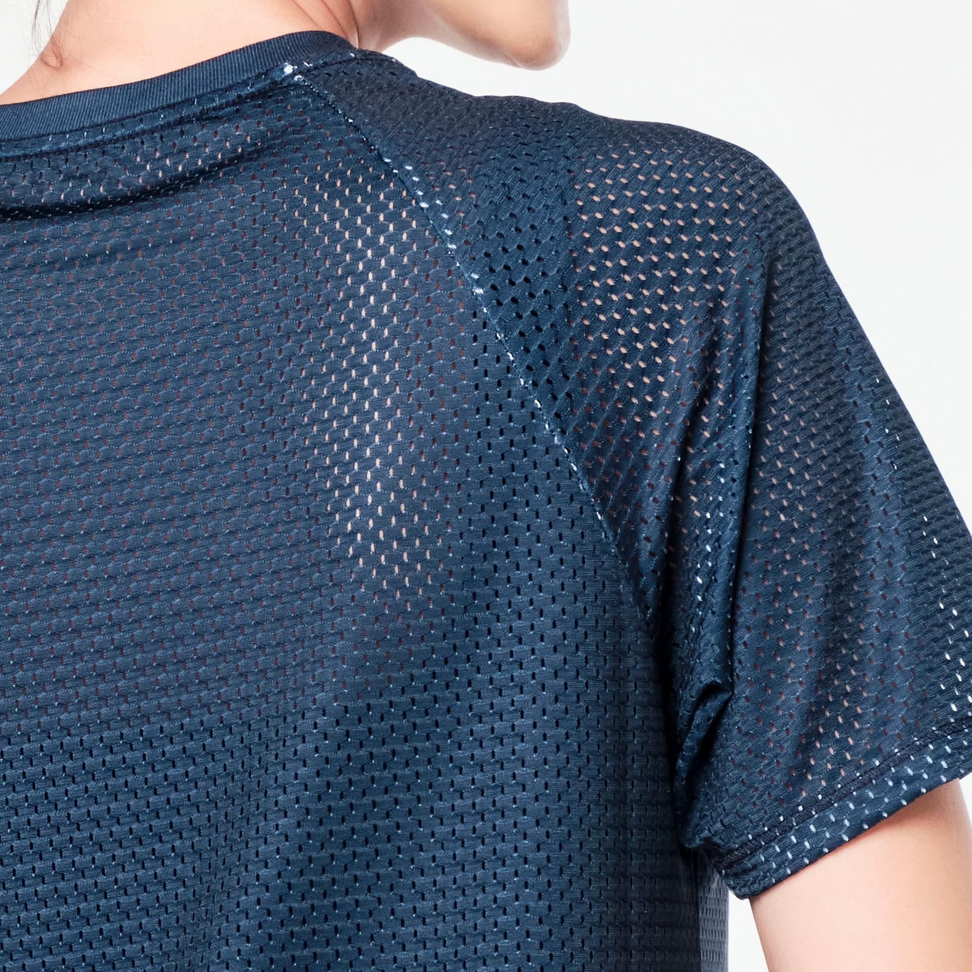The easy fit silhouette is complemented by a rib knit collar, adding a touch of sophistication to your activewear collection. The raglan sleeves enhance your range of motion, making this top ideal for high-energy activities like Zumba, yoga, or any fitness class that gets your heart racing. The mesh detailing not only elevates the aesthetic appeal but also promotes airflow, ensuring you remain cool even during the most intense sessions.