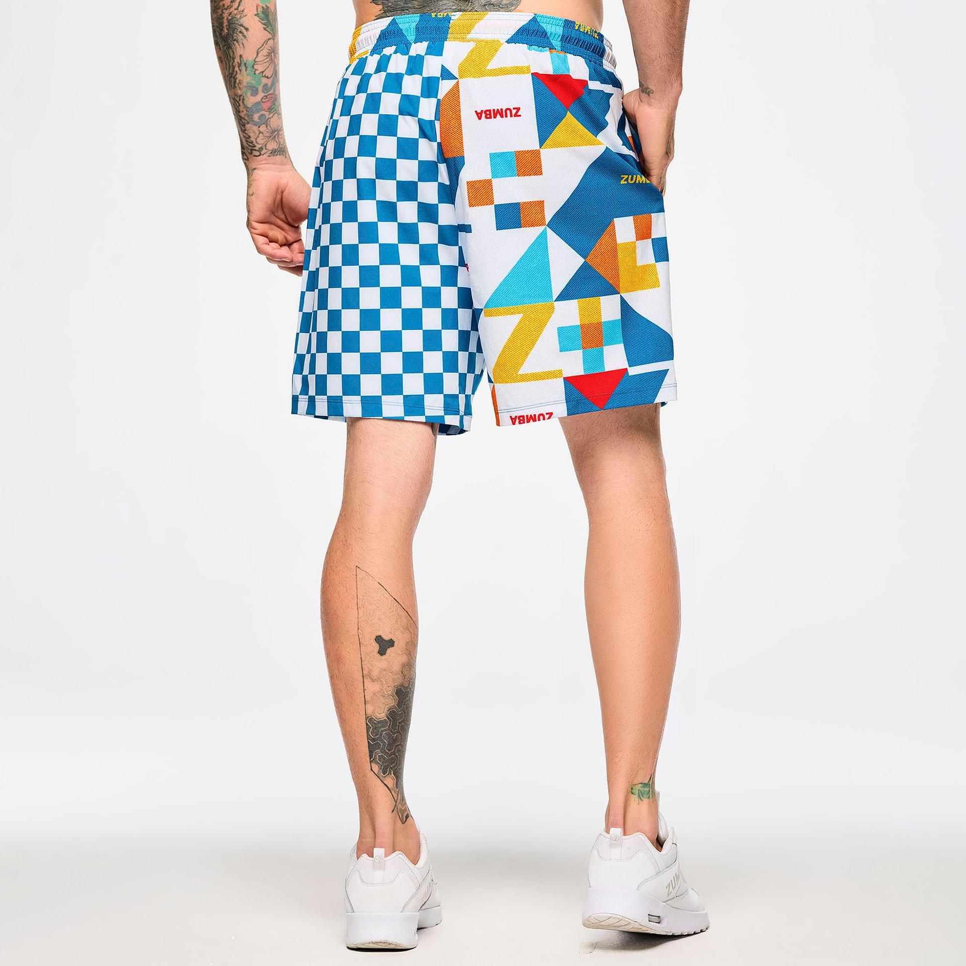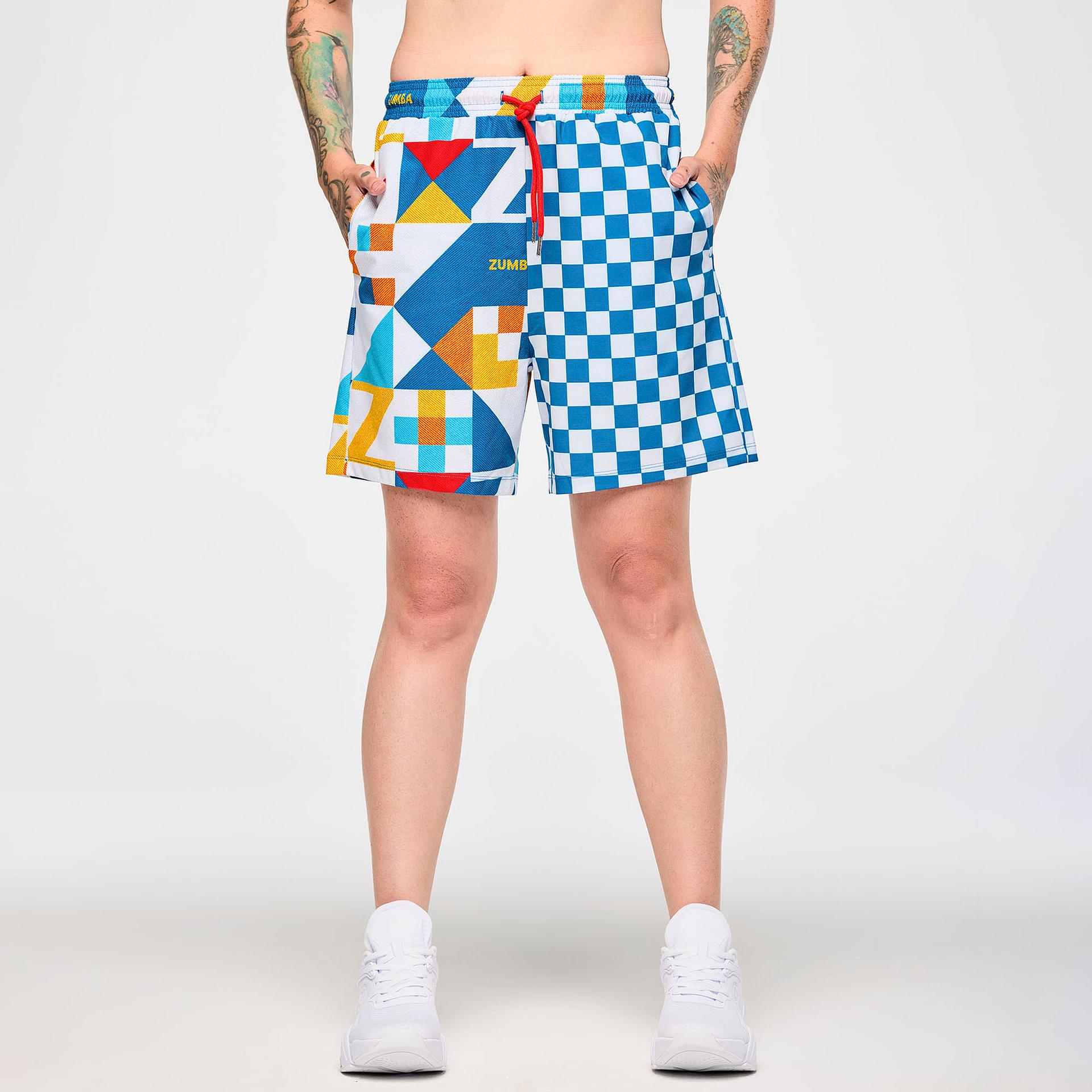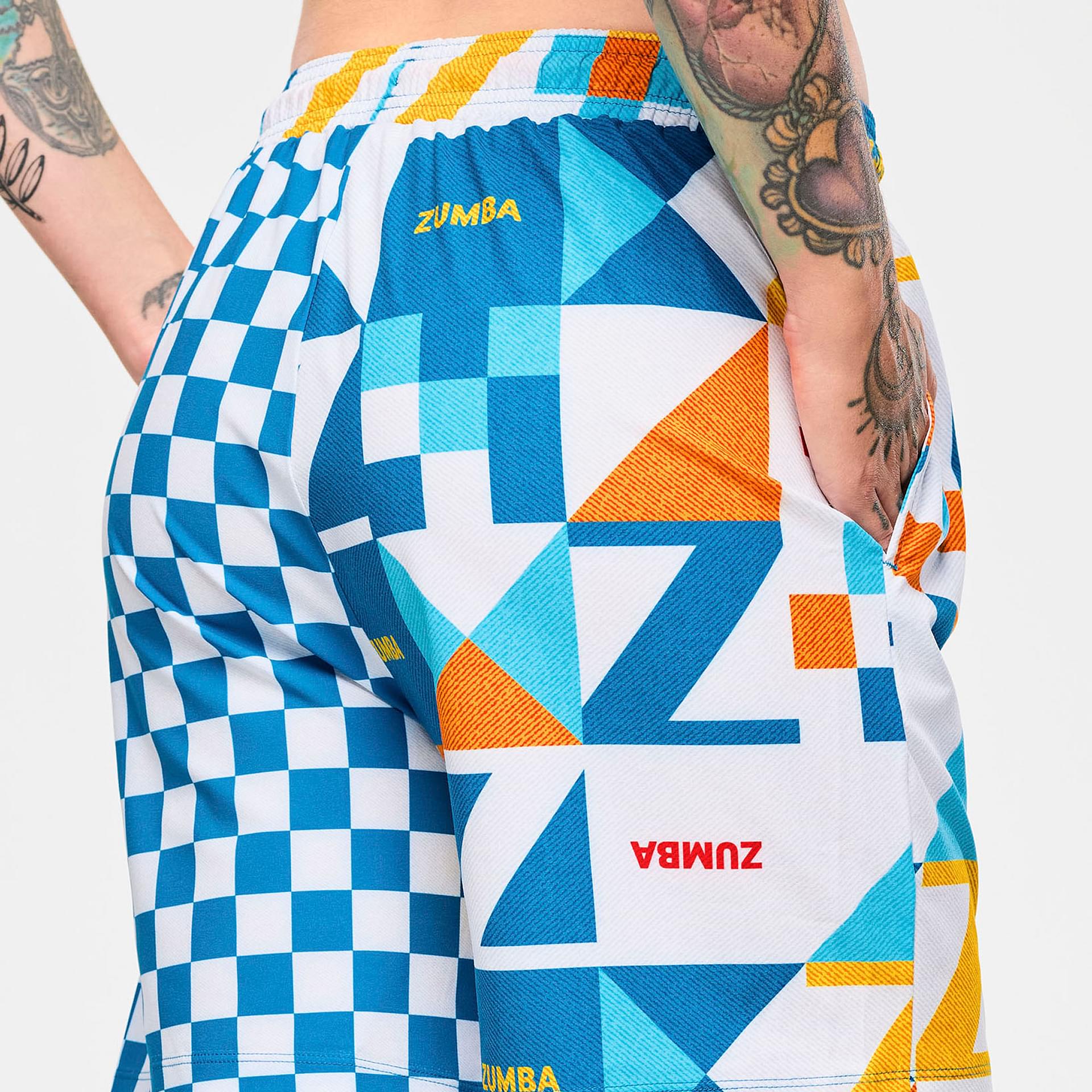 The shorts feature an encased elastic waistband with functional drawcords, allowing for a customizable fit that stays secure during movement. Inseam pockets offer convenient storage for small essentials, making these shorts as practical as they are stylish. The bold geometric Zumba-exclusive all-over prints add a vibrant touch, ensuring you stand out while you stay active.
