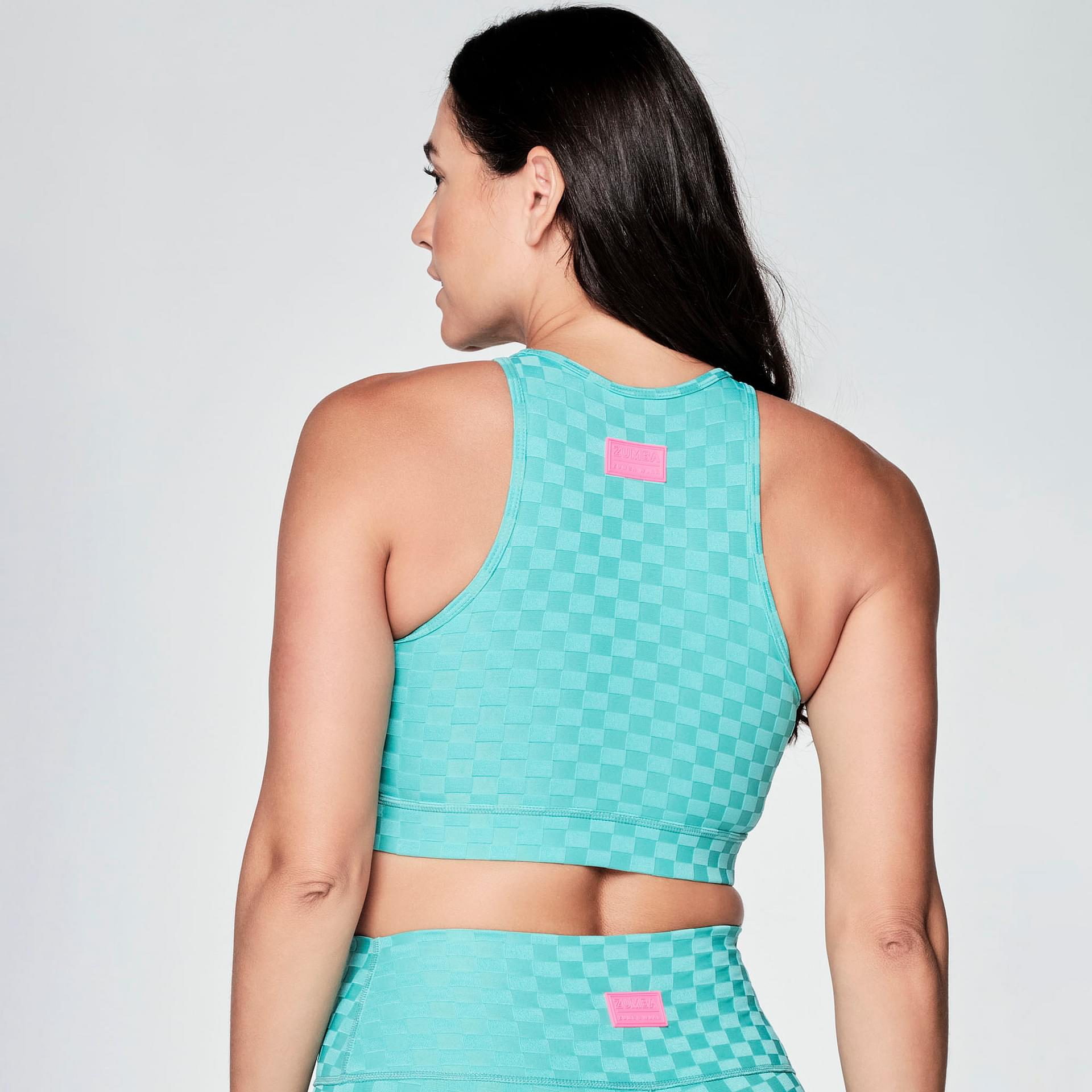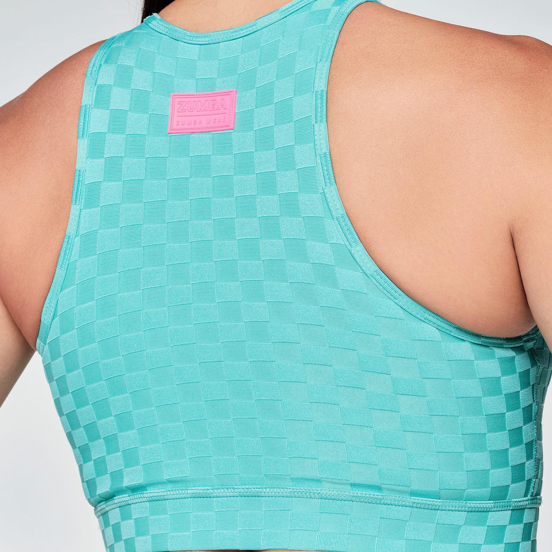 But what truly sets this bra tank apart is its checkered jacquard textured fabric. This unique design adds a touch of sophistication and style to your workout wardrobe. And to top it off, there's a branded rubber patch on the center back, adding a subtle yet stylish detail.
