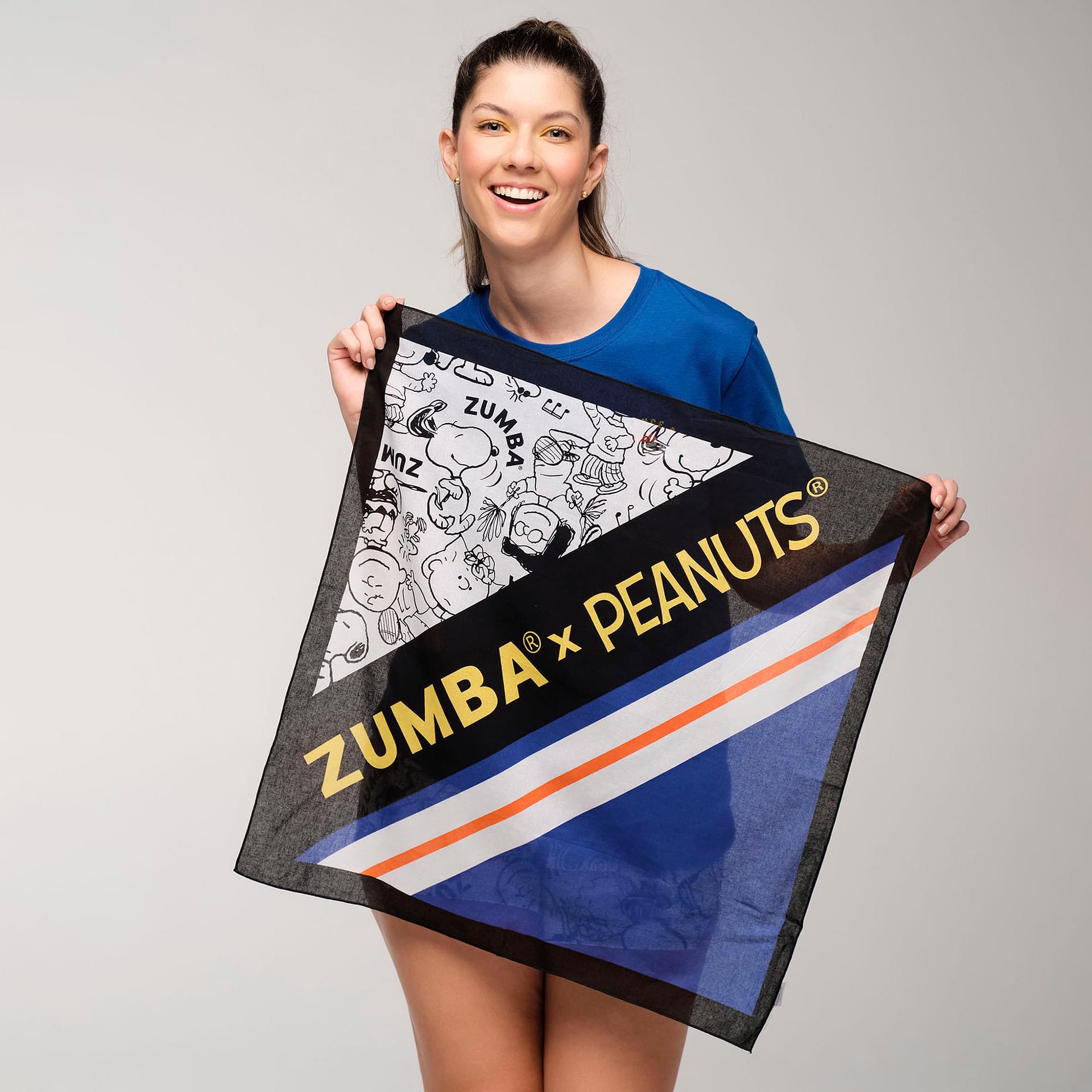 The first bandana features an eye-catching Peanuts all-over print, adorned with bold stripes and a vibrant yellow "Zumba x Peanuts" logo.