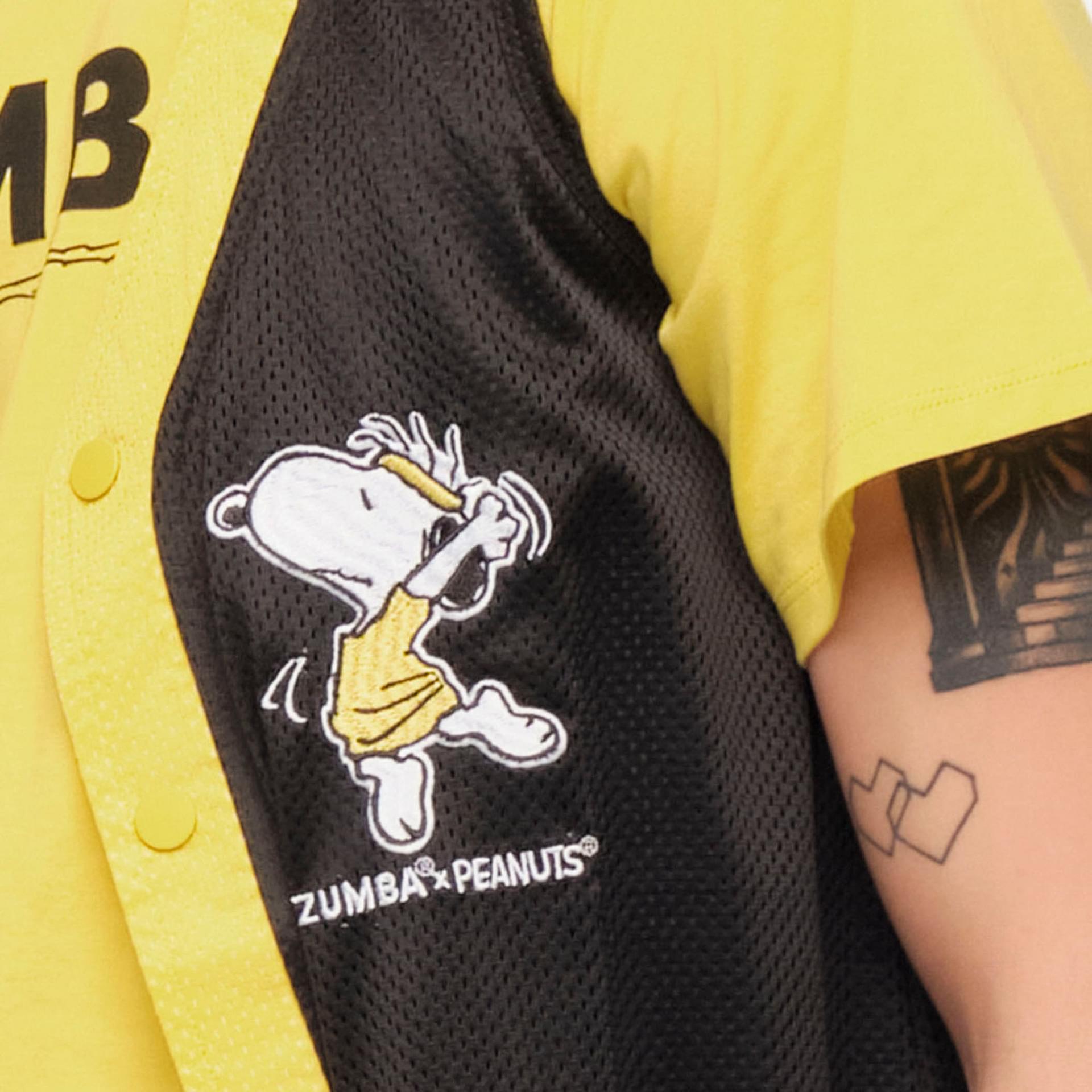 Functional snaps on the contrast color center front placket add a touch of sporty elegance, allowing for easy on-and-off wear. The rounded hem not only elevates the overall aesthetic but also provides a flattering shape that moves with you. Adorned with an embroidered Snoopy and Zumba® X Peanuts® logo on the front chest, this dress celebrates the playful spirit of both brands, while the embroidered branding on the back adds a unique touch that stands out.